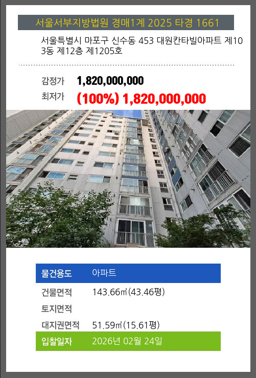 사건번호 2025 타경 1661 본건은 서울특별시 마포구 신수동 453 대원칸타빌아파트 제103동 제12층 제1205호소재하는 아파트경매 물건의 포스팅입니다. 건물면적 [ 143.66㎡ (43.46평) ]대지권 [ 51.59㎡ (15.61평) ]