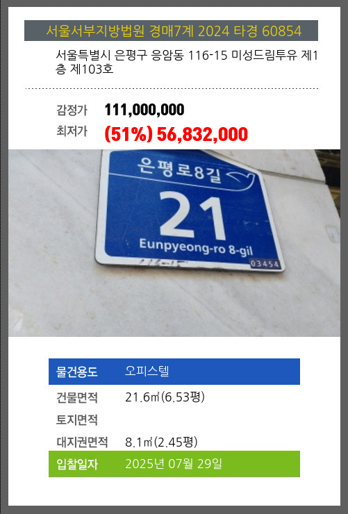 사건번호 2024 타경 60854 본건은 서울특별시 은평구 응암동 116-15 미성드림투유 제1층 제103호소재하는 오피스텔경매 물건의 포스팅입니다. 건물면적 [ 21.6㎡ (6.53평) ]대지권 [ 8.1㎡ (2.45평) ] 시세를