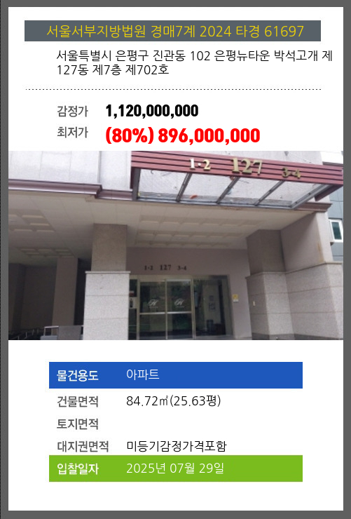사건번호 2024 타경 61697 본건은 서울특별시 은평구 진관동 102 은평뉴타운 박석고개 제127동 제7층 제702호소재하는 아파트경매 물건의 포스팅입니다. 건물면적 [ 84.72㎡ (25.63평) ]대지권 [ 미등기감정가격포함 ]