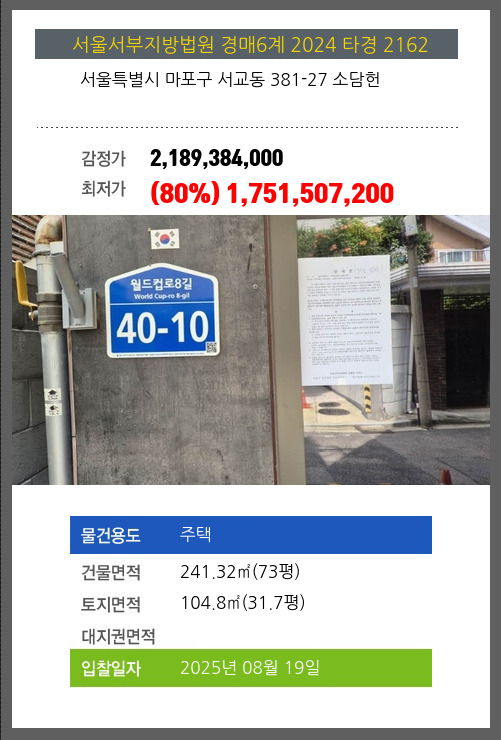 사건번호 2024 타경 2162 본건은 서울특별시 마포구 서교동 381-27 소담헌소재하는 주택경매 물건의 포스팅입니다. 건물면적 [ 241.32㎡ (73평) ]토지면적 [ 104.8㎡ (31.7평) ] 시세를 반영한 감정가