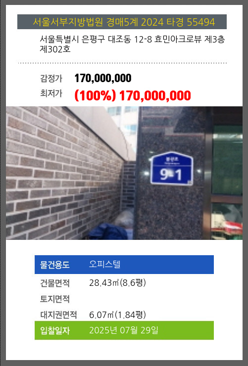 사건번호 2024 타경 55494 본건은 서울특별시 은평구 대조동 12-8 효민아크로뷰 제3층 제302호소재하는 오피스텔경매 물건의 포스팅입니다. 건물면적 [ 28.43㎡ (8.6평) ]대지권 [ 6.07㎡ (1.84평) ] 시세를