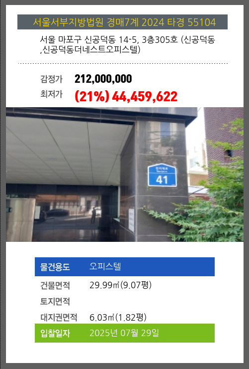 사건번호 2024 타경 55104 본건은 서울 마포구 신공덕동 14-5, 3층305호 (신공덕동,신공덕동더네스트오피스텔)소재하는 오피스텔경매 물건의 포스팅입니다. 건물면적 [ 29.99㎡ (9.07평) ]대지권 [ 6.03㎡ (1.82평) ] 시세를 반영한