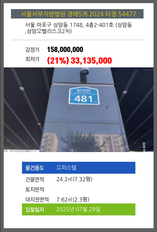 사건번호 2024 타경 54477 본건은 서울 마포구 상암동 1748, 4층2-401호 (상암동,상암오벨리스크2차)소재하는 오피스텔경매 물건의 포스팅입니다. 건물면적 [ 24.2㎡ (7.32평) ]대지권 [ 7.62㎡ (2.3평) ] 시세를 반영한