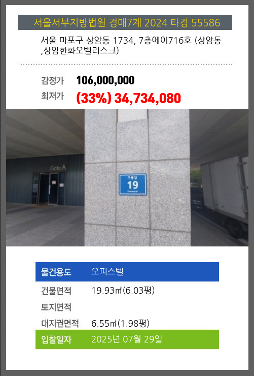 사건번호 2024 타경 55586 본건은 서울 마포구 상암동 1734, 7층에이716호 (상암동,상암한화오벨리스크)소재하는 오피스텔경매 물건의 포스팅입니다. 건물면적 [ 19.93㎡ (6.03평) ]대지권 [ 6.55㎡ (1.98평) ] 시세를 반영한