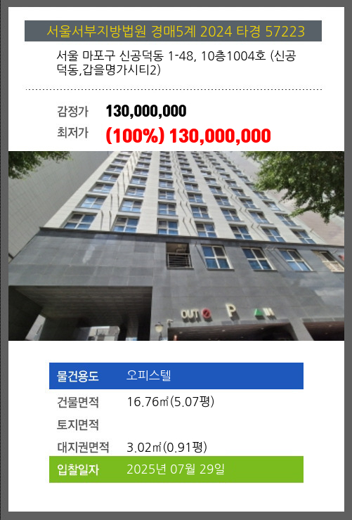 사건번호 2024 타경 57223 본건은 서울 마포구 신공덕동 1-48, 10층1004호 (신공덕동,갑을명가시티2)소재하는 오피스텔경매 물건의 포스팅입니다. 건물면적 [ 16.76㎡ (5.07평) ]대지권 [ 3.02㎡ (0.91평) ] 시세를 반영한