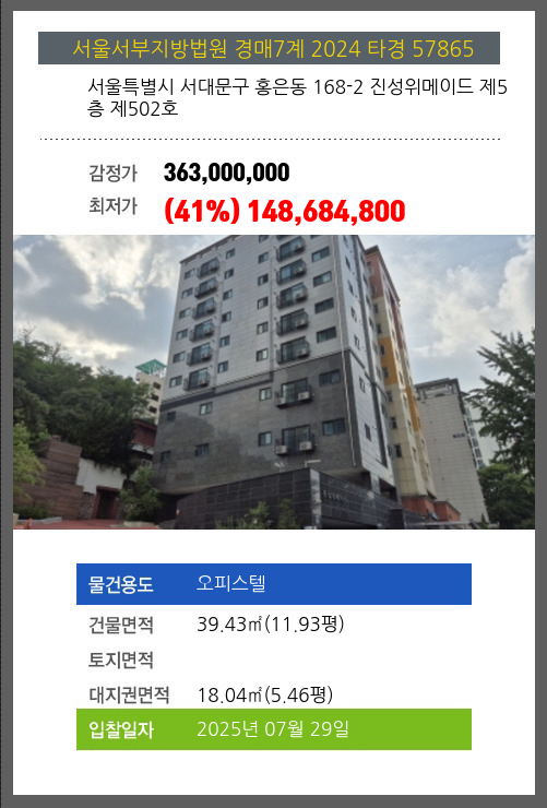 사건번호 2024 타경 57865 본건은 서울특별시 서대문구 홍은동 168-2 진성위메이드 제5층 제502호소재하는 오피스텔경매 물건의 포스팅입니다. 건물면적 [ 39.43㎡ (11.93평) ]대지권 [ 18.04㎡ (5.46평) ] 시세를