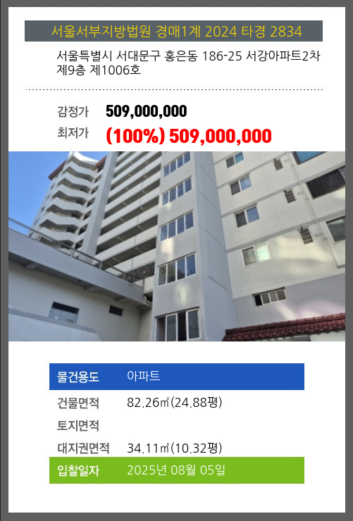 사건번호 2024 타경 2834 본건은 서울특별시 서대문구 홍은동 186-25 서강아파트2차 제9층 제1006호소재하는 아파트경매 물건의 포스팅입니다. 건물면적 [ 82.26㎡ (24.88평) ]대지권 [ 34.11㎡ (10.32평) ] 시세를