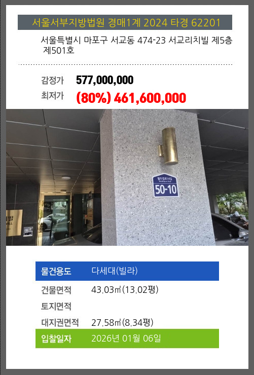 사건번호 2024 타경 62201 본건은 서울특별시 마포구 서교동 474-23 서교리치빌 제5층 제501호소재하는 다세대(빌라)경매 물건의 포스팅입니다. 건물면적 [ 43.03㎡ (13.02평) ]대지권 [ 27.58㎡ (8.34평) ] 시세를