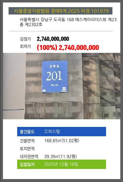 사건번호 2025 타경 101979 본건은 서울특별시 강남구 도곡동 168 에스케이리더스뷰 제23층 제2302호소재하는 오피스텔경매 물건의 포스팅입니다. 건물면적 [ 168.65㎡ (51.02평) ]대지권 [ 39.39㎡ (11.92평) ] 시세를