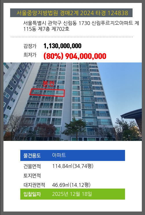 사건번호 2024 타경 124838 본건은 서울특별시 관악구 신림동 1730 신림푸르지오아파트 제115동 제7층 제702호소재하는 아파트경매 물건의 포스팅입니다. 건물면적 [ 114.84㎡ (34.74평) ]대지권 [ 46.69㎡ (14.12평) ]