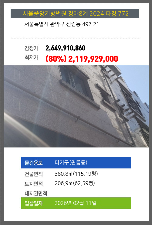사건번호 2024 타경 772 본건은 서울특별시 관악구 신림동 492-21소재하는 다가구(원룸등)경매 물건의 포스팅입니다. 건물면적 [ 380.8㎡ (115.19평) ]토지면적 [ 206.9㎡ (62.59평) ] 시세를 반영한 감정가 2,649,910,860에서1회