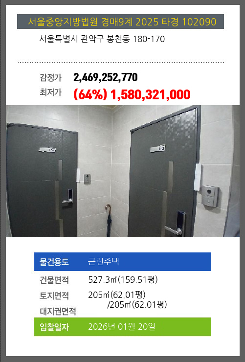 사건번호 2025 타경 102090 본건은 서울특별시 관악구 봉천동 180-170소재하는 근린주택경매 물건의 포스팅입니다. 건물면적 [ 527.3㎡ (159.51평) ]토지면적 [ 전체:205㎡ (62.01평) 매각지분:205㎡ (62.01평) ] 시세를 반영한