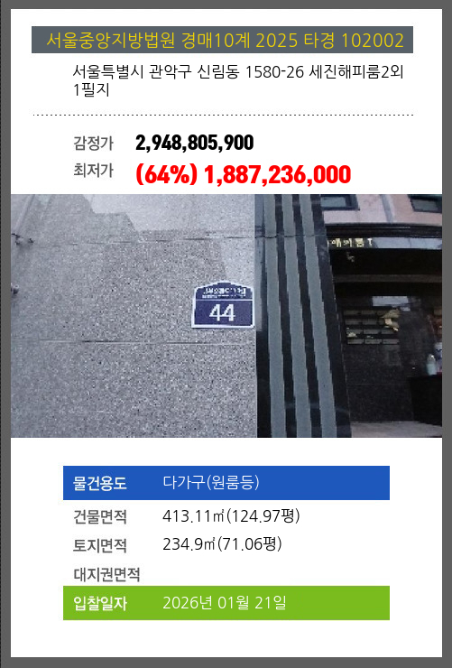 사건번호 2025 타경 102002 본건은 서울특별시 관악구 신림동 1580-26 세진해피룸2외 1필지소재하는 다가구(원룸등)경매 물건의 포스팅입니다. 건물면적 [ 413.11㎡ (124.97평) ]토지면적 [ 234.9㎡ (71.06평) ] 시세를 반영한