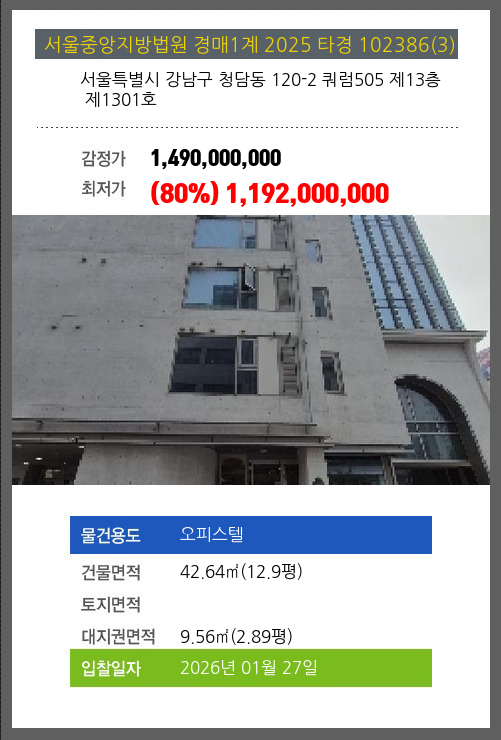 사건번호 2025 타경 102386(3) 본건은 서울특별시 강남구 청담동 120-2 쿼럼505 제13층 제1301호소재하는 오피스텔경매 물건의 포스팅입니다. 건물면적 [ 42.64㎡ (12.9평) ]대지권 [ 9.56㎡ (2.89평) ] 시세를