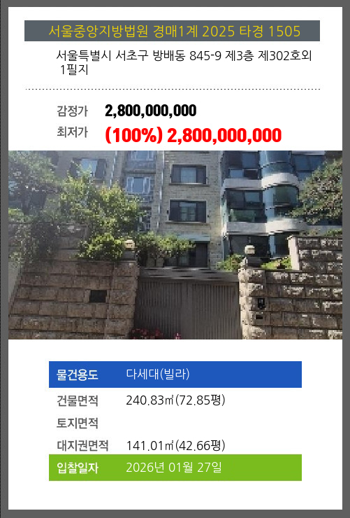 사건번호 2025 타경 1505 본건은 서울특별시 서초구 방배동 845-9 제3층 제302호외 1필지소재하는 다세대(빌라)경매 물건의 포스팅입니다. 건물면적 [ 240.83㎡ (72.85평) ]대지권 [ 141.01㎡ (42.66평) ] 시세를