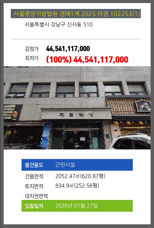 사건번호 2025 타경 102253(1) 본건은 서울특별시 강남구 신사동 510소재하는 근린시설경매 물건의 포스팅입니다. 건물면적 [ 2052.47㎡ (620.87평) ]토지면적 [ 834.9㎡ (252.56평) ] 시세를 반영한 감정가 44,541,117,000에서신건으로