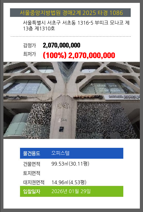 사건번호 2025 타경 1086 본건은 서울특별시 서초구 서초동 1316-5 부띠크 모나코 제13층 제1310호소재하는 오피스텔경매 물건의 포스팅입니다. 건물면적 [ 99.53㎡ (30.11평) ]대지권 [ 14.96㎡ (4.53평) ]