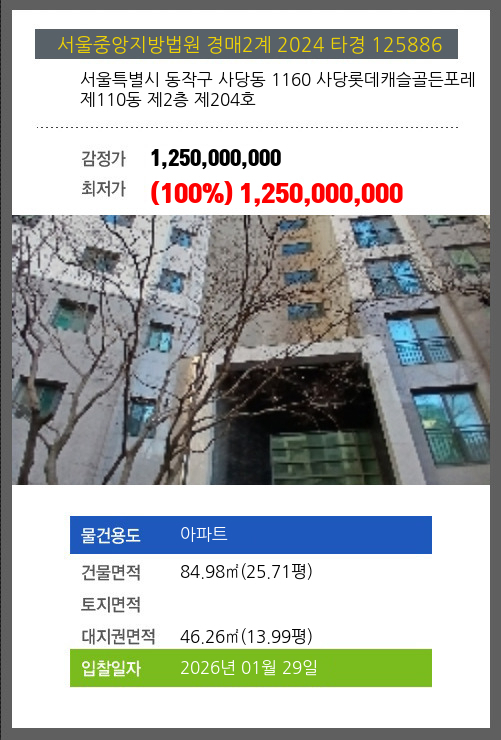 사건번호 2024 타경 125886 본건은 서울특별시 동작구 사당동 1160 사당롯데캐슬골든포레 제110동 제2층 제204호소재하는 아파트경매 물건의 포스팅입니다. 건물면적 [ 84.98㎡ (25.71평) ]대지권 [ 46.26㎡ (13.99평) ]