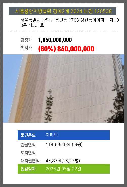 사건번호 2024 타경 120508 본건은 서울특별시 관악구 봉천동 1703 성현동아아파트 제108동 제301호소재하는 아파트경매 물건의 포스팅입니다. 건물면적 [ 114.69㎡ (34.69평) ]대지권 [ 43.87㎡ (13.27평) ] 시세를