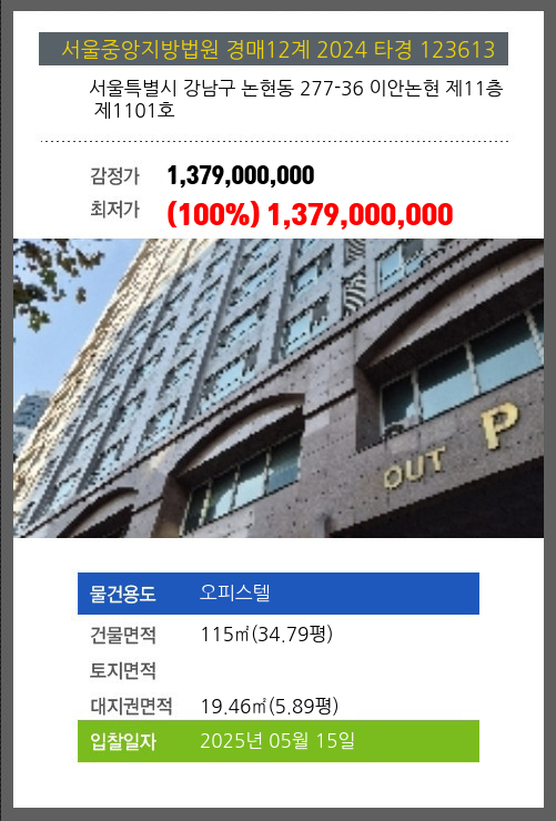 사건번호 2024 타경 123613 본건은 서울특별시 강남구 논현동 277-36 이안논현 제11층 제1101호소재하는 오피스텔경매 물건의 포스팅입니다. 건물면적 [ 115㎡ (34.79평) ]대지권 [ 19.46㎡ (5.89평) ] 시세를