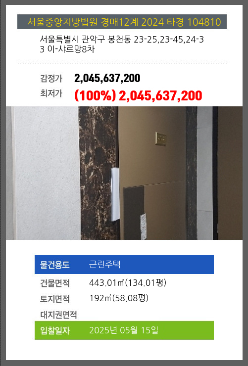 사건번호 2024 타경 104810 본건은 서울특별시 관악구 봉천동 23-25,23-45,24-33 이-샤르망8차소재하는 근린주택경매 물건의 포스팅입니다. 건물면적 [ 443.01㎡ (134.01평) ]토지면적 [ 192㎡ (58.08평) ] 시세를 반영한 감정가