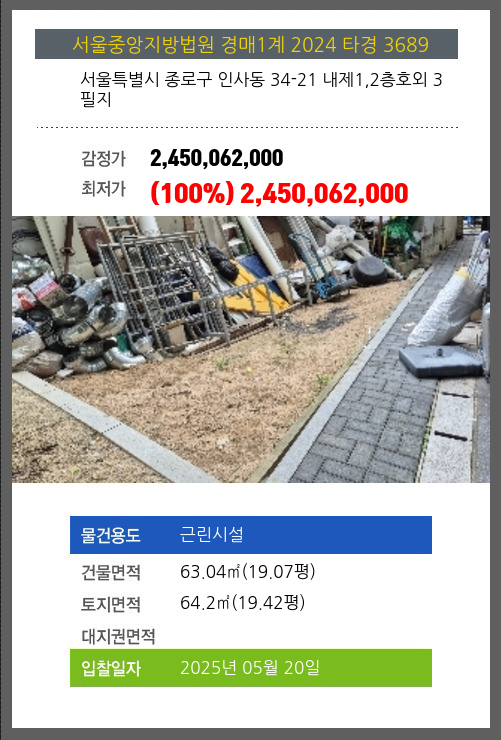 사건번호 2024 타경 3689 본건은 서울특별시 종로구 인사동 34-21 내제1,2층호외 3필지소재하는 근린시설경매 물건의 포스팅입니다. 건물면적 [ 63.04㎡ (19.07평) ]토지면적 [ 64.2㎡ (19.42평) ] 시세를 반영한