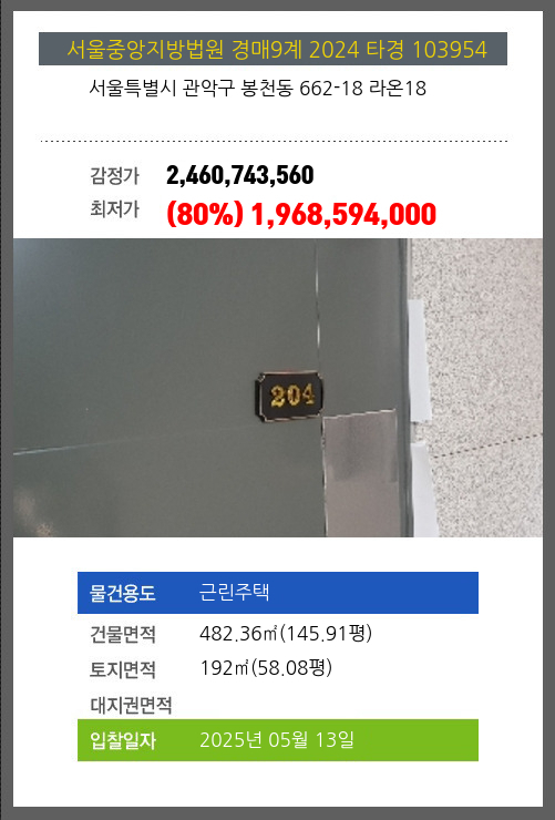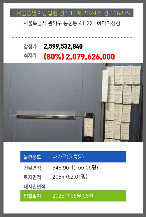 사건번호 2024 타경 116875 본건은 서울특별시 관악구 봉천동 41-221 아다미성현소재하는 다가구(원룸등)경매 물건의 포스팅입니다. 건물면적 [ 548.96㎡ (166.06평) ]토지면적 [ 205㎡ (62.01평) ] 시세를 반영한 감정가