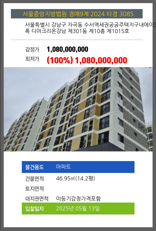 사건번호 2024 타경 3085 본건은 서울특별시 강남구 자곡동 수서역세권공공주택지구내에이3블록 디아크리온강남 제301동 제10층 제1015호소재하는 아파트경매 물건의 포스팅입니다. 건물면적 [ 46.95㎡ (14.2평) ]대지권 [ 미등기감정가격포함 ] 시세를
