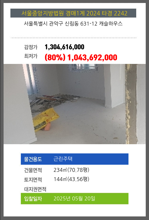 사건번호 2024 타경 2242 본건은 서울특별시 관악구 신림동 631-12 캐슬하우스소재하는 근린주택경매 물건의 포스팅입니다. 건물면적 [ 234㎡ (70.78평) ]토지면적 [ 144㎡ (43.56평) ] 시세를 반영한 감정가