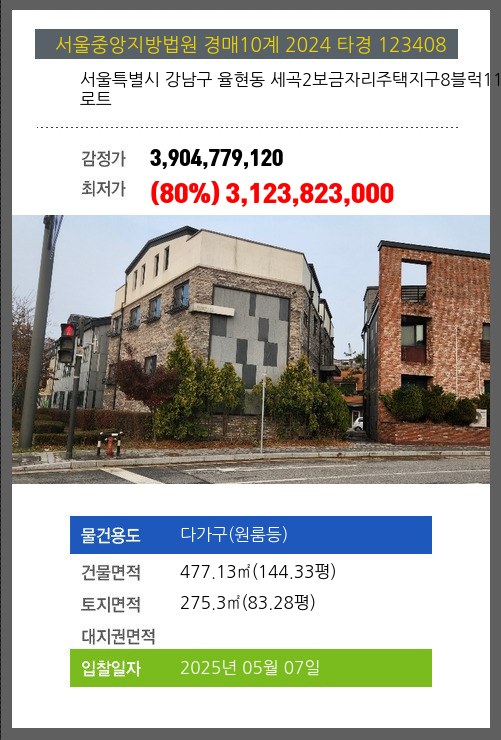 사건번호 2024 타경 123408 본건은 서울특별시 강남구 율현동 세곡2보금자리주택지구8블럭11로트소재하는 다가구(원룸등)경매 물건의 포스팅입니다. 건물면적 [ 477.13㎡ (144.33평) ]토지면적 [ 275.3㎡ (83.28평) ] 시세를 반영한 감정가 3,904,779,120에서1회
