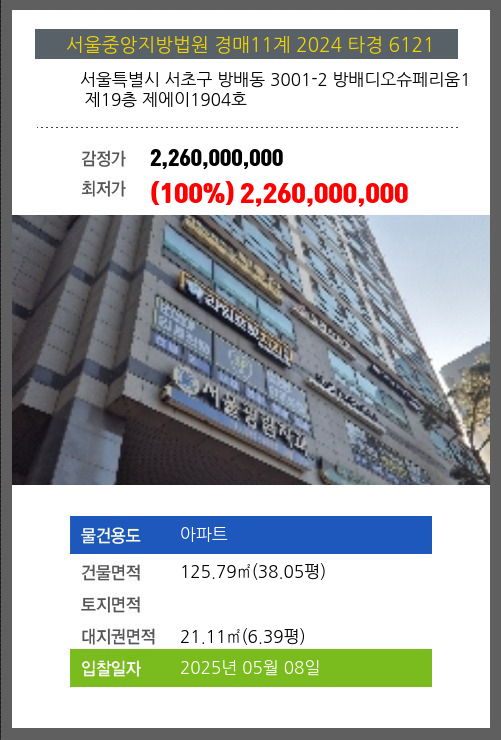 사건번호 2024 타경 6121 본건은 서울특별시 서초구 방배동 3001-2 방배디오슈페리움1 제19층 제에이1904호소재하는 아파트경매 물건의 포스팅입니다. 건물면적 [ 125.79㎡ (38.05평) ]대지권 [ 21.11㎡ (6.39평) ] 시세를