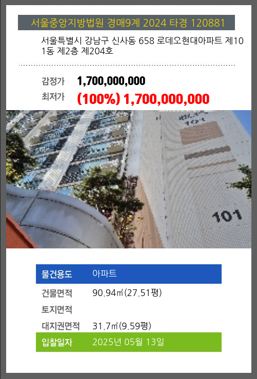 사건번호 2024 타경 120881 본건은 서울특별시 강남구 신사동 658 로데오현대아파트 제101동 제2층 제204호소재하는 아파트경매 물건의 포스팅입니다. 건물면적 [ 90.94㎡ (27.51평) ]대지권 [ 31.7㎡ (9.59평) ]