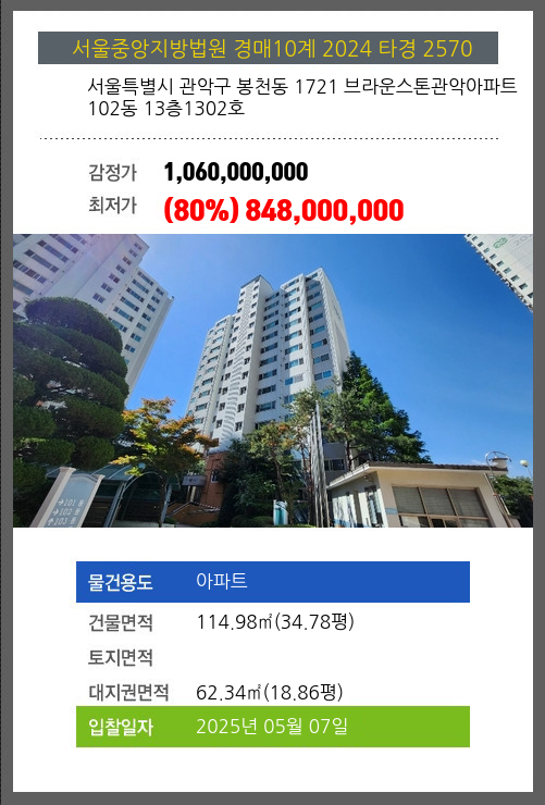 사건번호 2024 타경 2570 본건은 서울특별시 관악구 봉천동 1721 브라운스톤관악아파트 102동 13층1302호소재하는 아파트경매 물건의 포스팅입니다. 건물면적 [ 114.98㎡ (34.78평) ]대지권 [ 62.34㎡ (18.86평) ] 시세를