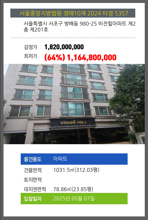 사건번호 2024 타경 5357 본건은 서울특별시 서초구 방배동 980-25 비전힐아파트 제2층 제201호소재하는 아파트경매 물건의 포스팅입니다. 건물면적 [ 1031.5㎡ (312.03평) ]대지권 [ 78.86㎡ (23.85평) ] 시세를