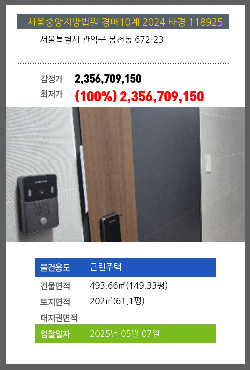 사건번호 2024 타경 118925 본건은 서울특별시 관악구 봉천동 672-23소재하는 근린주택경매 물건의 포스팅입니다. 건물면적 [ 493.66㎡ (149.33평) ]토지면적 [ 202㎡ (61.1평) ] 시세를 반영한 감정가 2,356,709,150에서신건으로