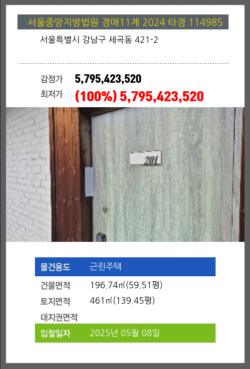 사건번호 2024 타경 114985 본건은 서울특별시 강남구 세곡동 421-2소재하는 근린주택경매 물건의 포스팅입니다. 건물면적 [ 196.74㎡ (59.51평) ]토지면적 [ 461㎡ (139.45평) ] 시세를 반영한 감정가 5,795,423,520에서신건으로