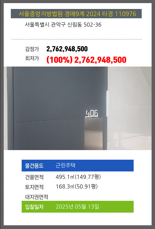 사건번호 2024 타경 110976 본건은 서울특별시 관악구 신림동 502-36소재하는 근린주택경매 물건의 포스팅입니다. 건물면적 [ 495.1㎡ (149.77평) ]토지면적 [ 168.3㎡ (50.91평) ] 시세를 반영한 감정가 2,762,948,500에서신건으로