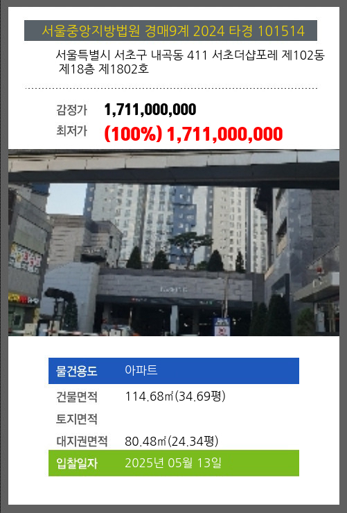 사건번호 2024 타경 101514 본건은 서울특별시 서초구 내곡동 411 서초더샵포레 제102동 제18층 제1802호소재하는 아파트경매 물건의 포스팅입니다. 건물면적 [ 114.68㎡ (34.69평) ]대지권 [ 80.48㎡ (24.34평) ]
