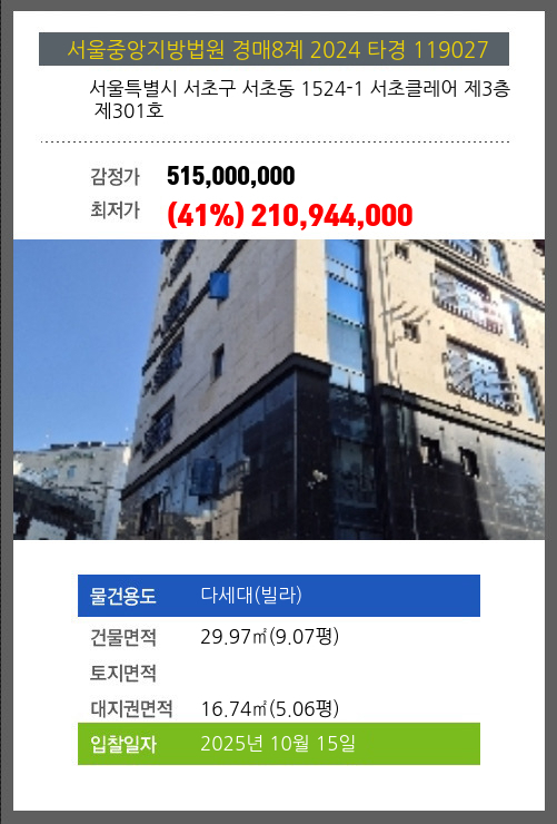 사건번호 2024 타경 119027 본건은 서울특별시 서초구 서초동 1524-1 서초클레어 제3층 제301호소재하는 다세대(빌라)경매 물건의 포스팅입니다. 건물면적 [ 29.97㎡ (9.07평) ]대지권 [ 16.74㎡ (5.06평) ] 시세를