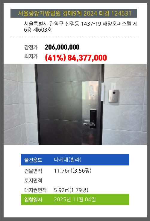 사건번호 2024 타경 124531 본건은 서울특별시 관악구 신림동 1437-19 태양오피스텔 제6층 제603호소재하는 다세대(빌라)경매 물건의 포스팅입니다. 건물면적 [ 11.76㎡ (3.56평) ]대지권 [ 5.92㎡ (1.79평) ] 시세를