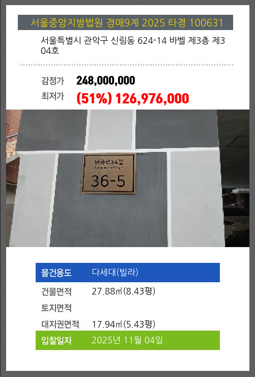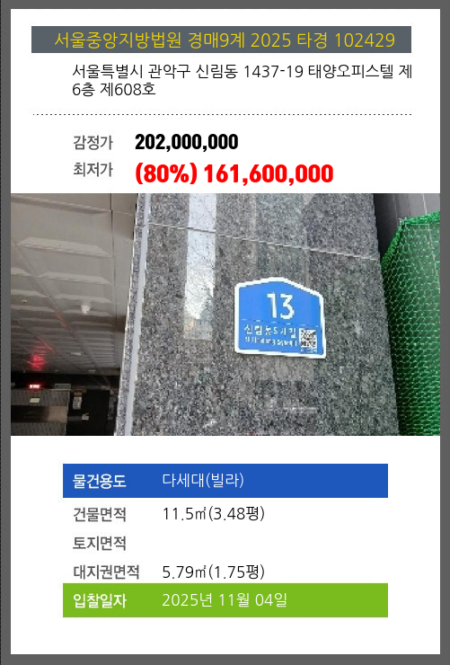 사건번호 2025 타경 102429 본건은 서울특별시 관악구 신림동 1437-19 태양오피스텔 제6층 제608호소재하는 다세대(빌라)경매 물건의 포스팅입니다. 건물면적 [ 11.5㎡ (3.48평) ]대지권 [ 5.79㎡ (1.75평) ] 시세를