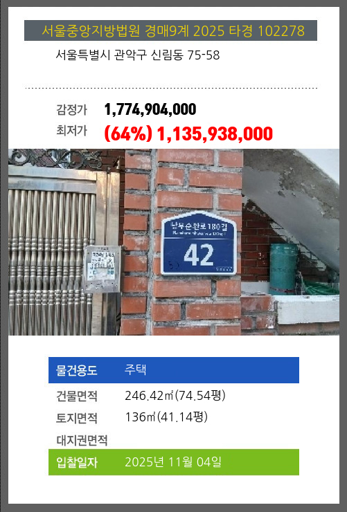 사건번호 2025 타경 102278 본건은 서울특별시 관악구 신림동 75-58소재하는 주택경매 물건의 포스팅입니다. 건물면적 [ 246.42㎡ (74.54평) ]토지면적 [ 136㎡ (41.14평) ] 시세를 반영한 감정가 1,774,904,000에서2회