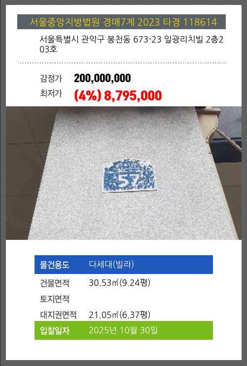 사건번호 2023 타경 118614 본건은 서울특별시 관악구 봉천동 673-23 일광리치빌 2층203호소재하는 다세대(빌라)경매 물건의 포스팅입니다. 건물면적 [ 30.53㎡ (9.24평) ]대지권 [ 21.05㎡ (6.37평) ] 시세를 반영한