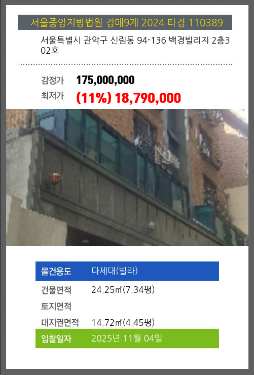 사건번호 2024 타경 110389 본건은 서울특별시 관악구 신림동 94-136 백경빌리지 2층302호소재하는 다세대(빌라)경매 물건의 포스팅입니다. 건물면적 [ 24.25㎡ (7.34평) ]대지권 [ 14.72㎡ (4.45평) ] 시세를 반영한