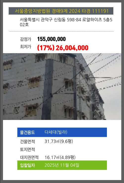 사건번호 2024 타경 111191 본건은 서울특별시 관악구 신림동 598-84 로얄하이츠 5층502호소재하는 다세대(빌라)경매 물건의 포스팅입니다. 건물면적 [ 31.73㎡ (9.6평) ]대지권 [ 16.17㎡ (4.89평) ] 시세를 반영한