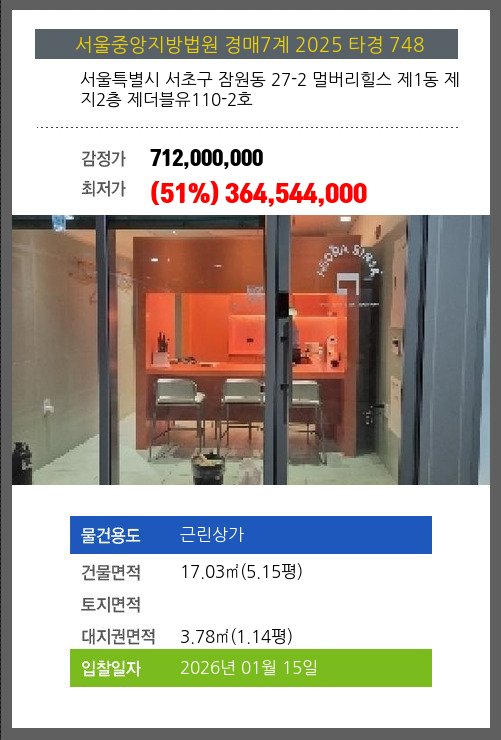 사건번호 2025 타경 748 본건은 서울특별시 서초구 잠원동 27-2 멀버리힐스 제1동 제지2층 제더블유110-2호소재하는 근린상가경매 물건의 포스팅입니다. 건물면적 [ 17.03㎡ (5.15평) ]대지권 [ 3.78㎡ (1.14평) ]