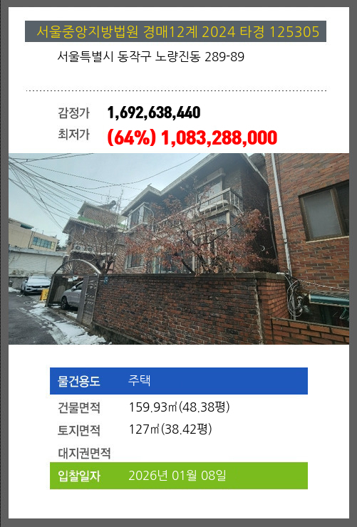 사건번호 2024 타경 125305 본건은 서울특별시 동작구 노량진동 289-89소재하는 주택경매 물건의 포스팅입니다. 건물면적 [ 159.93㎡ (48.38평) ]토지면적 [ 127㎡ (38.42평) ] 시세를 반영한 감정가 1,692,638,440에서2회
