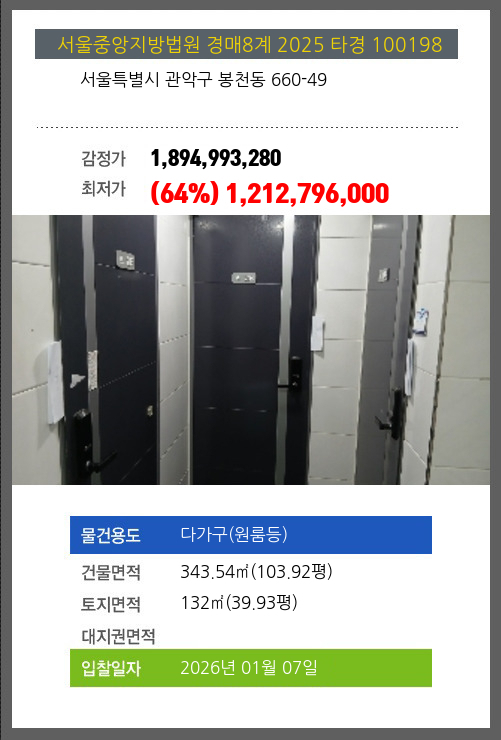 사건번호 2025 타경 100198 본건은 서울특별시 관악구 봉천동 660-49소재하는 다가구(원룸등)경매 물건의 포스팅입니다. 건물면적 [ 343.54㎡ (103.92평) ]토지면적 [ 132㎡ (39.93평) ] 시세를 반영한 감정가 1,894,993,280에서2회