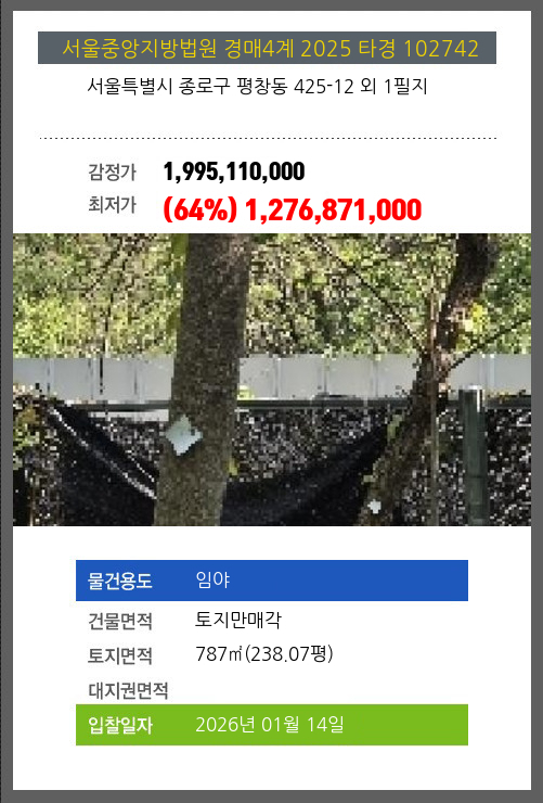 사건번호 2025 타경 102742 본건은 서울특별시 종로구 평창동 425-12 외 1필지소재하는 임야경매 물건의 포스팅입니다. 건물면적 [ 토지만매각 ]토지면적 [ 787㎡ (238.07평) ] 시세를 반영한 감정가