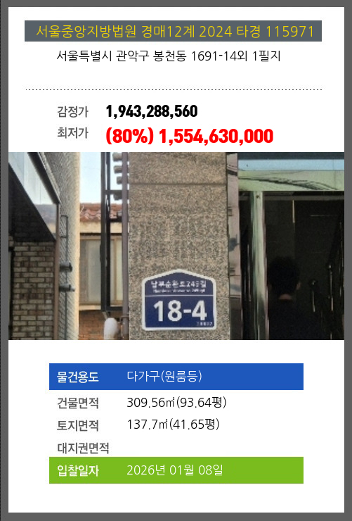 사건번호 2024 타경 115971 본건은 서울특별시 관악구 봉천동 1691-14외 1필지소재하는 다가구(원룸등)경매 물건의 포스팅입니다. 건물면적 [ 309.56㎡ (93.64평) ]토지면적 [ 137.7㎡ (41.65평) ] 시세를 반영한 감정가